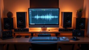 ミキシングエンジニアがDAWのEQとコンプレッサーを使ってミックス作業をしているスタジオ環境